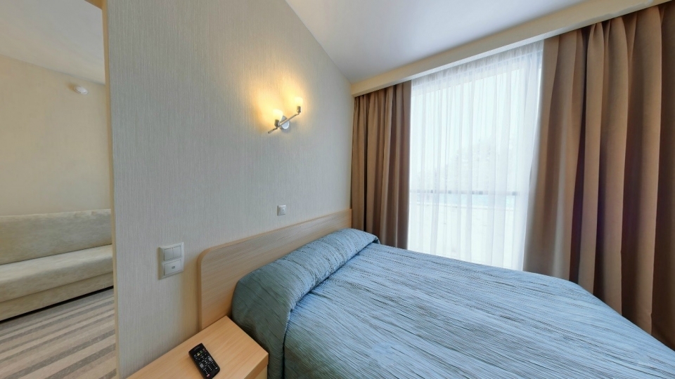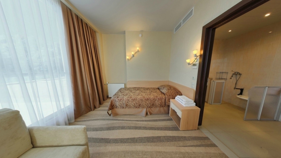 Оснащение номера: Двуспальная кровать, диван, обеденная группа, фен, тапочки, гладильный центр, телевизор, фригобар, шкаф для посуды, сервиз (6 персон), комплект столовых приборов (6 персон), сейф, wi-fi