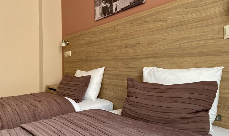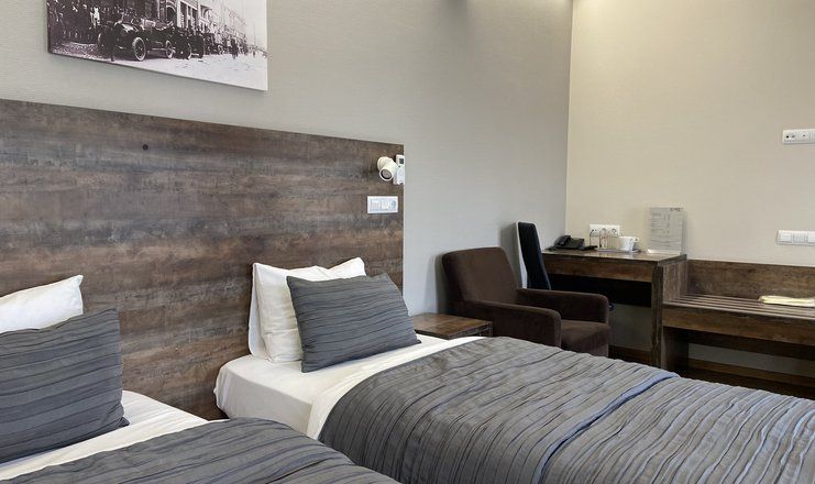 В номере: кровати односпальные, прикроватные тумбочки, стол, стулья, кресло, шкаф, сейф, сплит-система, телевизор, телефон, чайная посуда