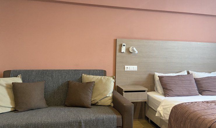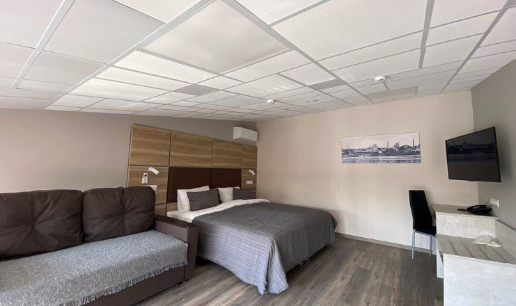 В номере: кровать двуспальная, прикроватные тумбочки, стол, стулья, диван, шкаф, сейф, сплит-система, телевизор, телефон, холодильник
