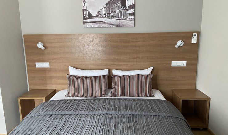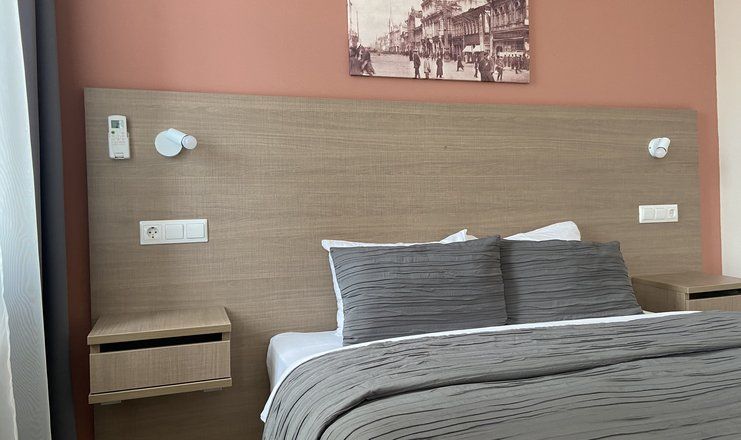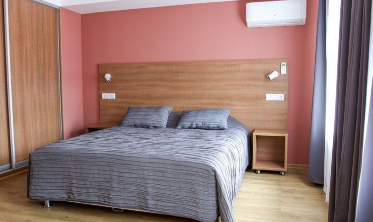 В номере: кровать двуспальная, прикроватные тумбочки, стол, стулья, шкаф, диван, сейф, сплит-система, телевизор, телефон, холодильник