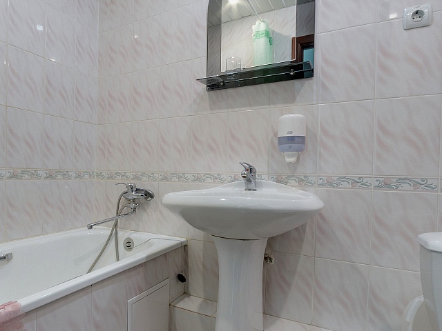 Санузел: раковина, унитаз, ванна или душевая кабина, фен