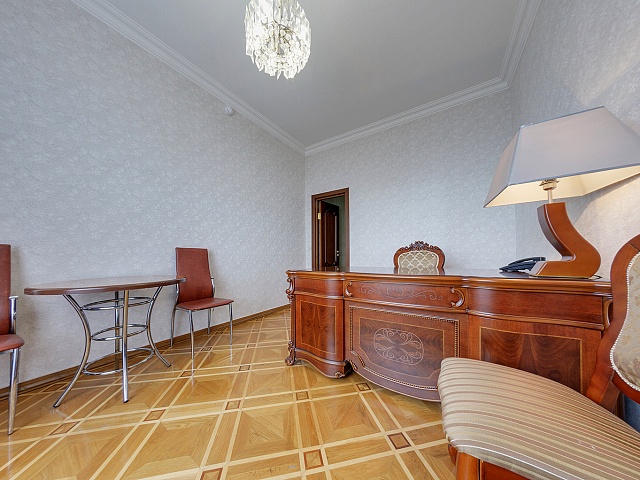 В номере: 2 комнаты, 2 кровати, диван, 2 кресла, тумба прикроватная, тумба TV, журнальный столик, стол туалетный с зеркалом, платяной и встроенный шкафы, обеденный гарнитур, рабочее место, телевизор, кондиционер, холодильник, телефон