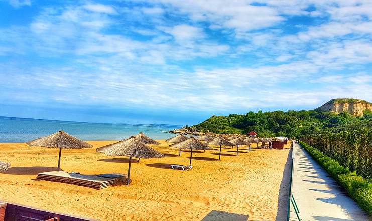 Пляж- песчаный, оборудован зонтами, лежаками, медицинским постом, туалетом