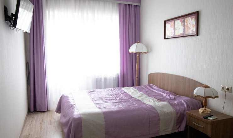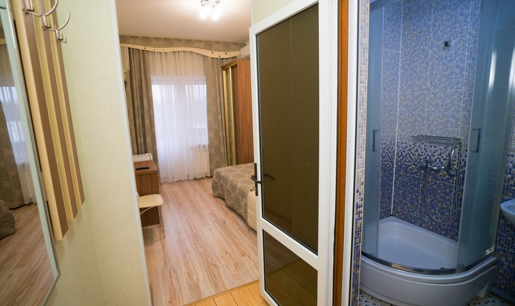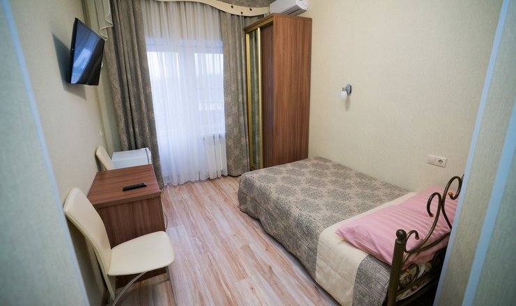 В номере: шкаф-купе, стол-тумба, 2 стула, кровать 1,20 м., ЖК телевизор, кондиционер, холодильник, зеркало, вешалка для верхней одежды.