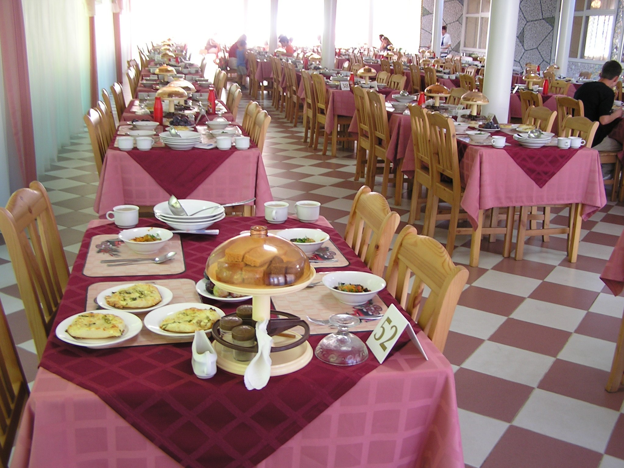 Приемы пищи проходят в банкетном зале. Здесь причудливым образом сочетаются оттенки шоколадного и розового цвета, и площадка выглядит торжественно. Шахматный пол придает пространству строгость, не нарушая ореола элегантности. Главное украшение зала – огромные панорамные окна, из которых открывается потрясающий вид на живописные окрестности.