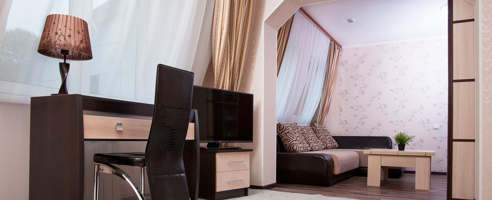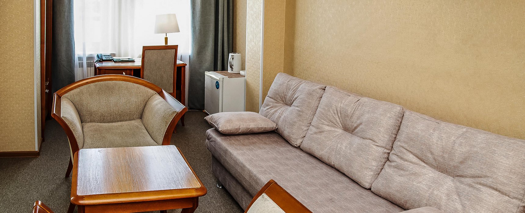 В номере: телевизор, цифровое ТВ, мягкая мебель, кухонная зона, чайник, микроволновая печь, холодильник, мини-бар